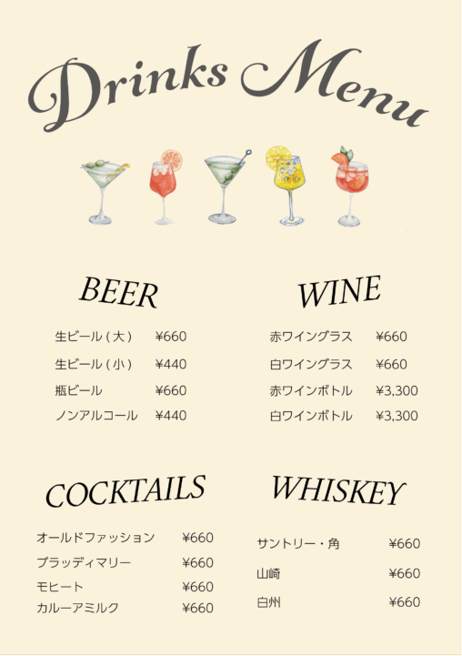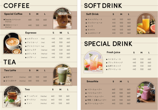 おしゃれでカジュアルなカフェをイメージしてドリンクメニュ…
